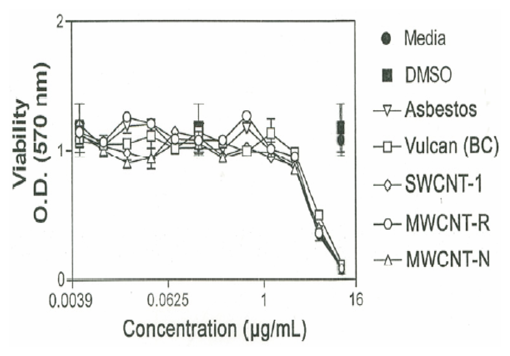 The cytotoxic effect of the various nanoparticulate materials on murine alveolar macrophages is shown in Figure 6. As shown in Figure 6 cells exposed to media or DMSO alone are viable, with O.D. readings of approximately unity. The macrophages were exposed to increasing concentrations of each of the nanoparticulate materials, starting at 0.005μg/mL and increasing to 10μg/mL in doubling concentrations. The nanoparticulate materials, including the chrysotile asbestos, began to induce cellular death at a threshold of 2.5μg/mL. Essentially all of the carbon nanoparticulate materials exhibited a cytotoxic response (as relative macrophage cell viability) similar to the chrysotile asbestos.