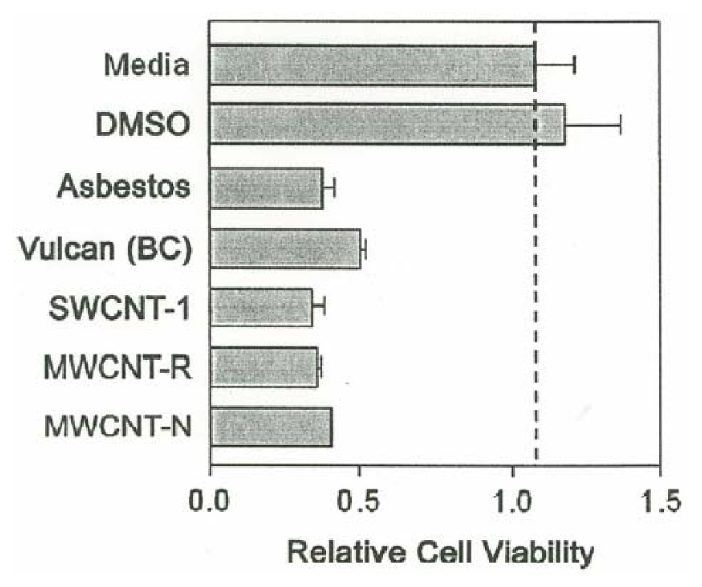 Comparative cytotoxicities of carbonaceous nanoparticulate aggregates and chrysotile asbestos nanotube aggregates to murine macrophage cells referenced to the media and DMSO solutions at a concentration of 5μg/mL. The relative cell viability was measured by optical densitometry at 570 nm.