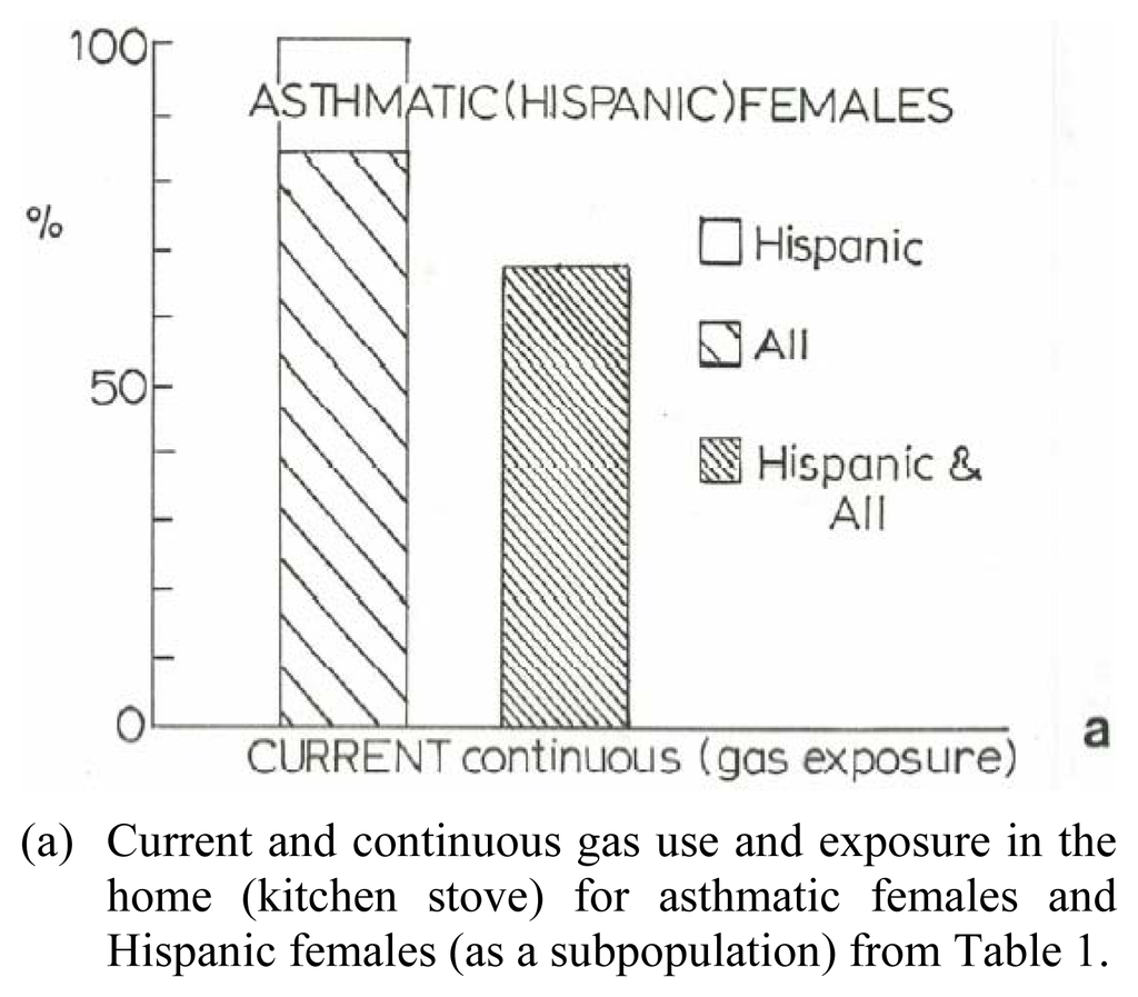 Asthma patient data was collected by having clinical patients fill out a 2-page questionnaire randomly selected at the time of routine clinic/office visits during the Fall and Winter months of 2003–2004. The randomness of those completing the questionnaire also contributed to the overall sample randomness. Principal questions included whether or not patients were currently and continuously exposed to kitchen gas stoves. There may be some intrinsic bias in the data collected since all clinic patients were assumed to have some respiratory health problem. The data selected involved those with some recognized asthma symptoms. Asthma categories were designated severe, moderate, and mild based upon standard office spirometer readings, or forced expiratory volume (of exhaled air) in 1 second: FEV1[25]. The focus on kitchen gas stove use and exposure stems from the collection and observation of carbon nanotubes and related carbon nanoparticulate aggregates in kitchen stove exhausts, and fuel-gas combustion sources in general, in both the indoor and outdoor environments [11, 17].