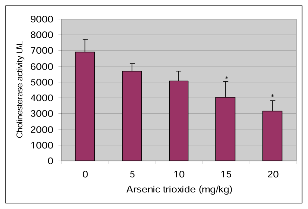 There is increasing interest in the development of new methods for assessing chemical toxicity, and the use of knowledge of mechanisms of toxic actions to improve this assessment. In order to determine the effect on serum acetyl cholinesterase (AChE), adult male Sprague-Dawley rats were exposed for five days to four different concentrations (5, 10, 15, 20 mg/kg) of arsenic trioxide. The data obtained from this study clearly show that arsenic trioxide significantly decreased the activity of serum acetyl cholinesterase in a dose-dependent manner (Figure 1). The results agree with previous studies that demonstrated a decreased activity of acetyl cholinesterase in neuroblastoma cells of mice [24], in rat whole brain [23, 25] and in two models of fish [26].