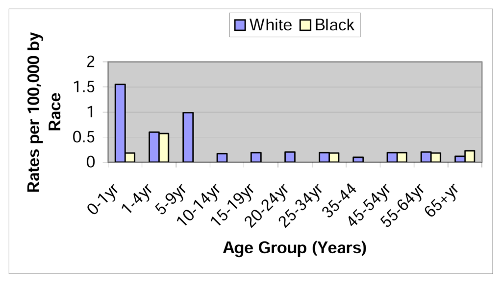 E. coli O157:H7 average incidence rates by race and age for the years 1996–2001 in Louisiana (LDHH 2001).