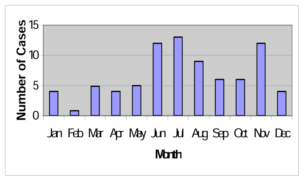 Figure 2 shows that of the years 1996–2001, the majority of the cases were reported for young Caucasian infants and children between the ages of 0 and 9 years of age. The highest number of cases reported during the years of 1996–2001 was found in St. Tammany Parish with a total of 11 cases. Figure 3 shows that the E. coli O157:H7 number of cases reported increased during the months of June, July, August and November. These months reported 12, 13, and 9 cases, respectively. During 1999, sixty-four percent of the cases reported occurred between the months of June and September. For the years of 1996–2001, 1 case was reported during the month of February [12].