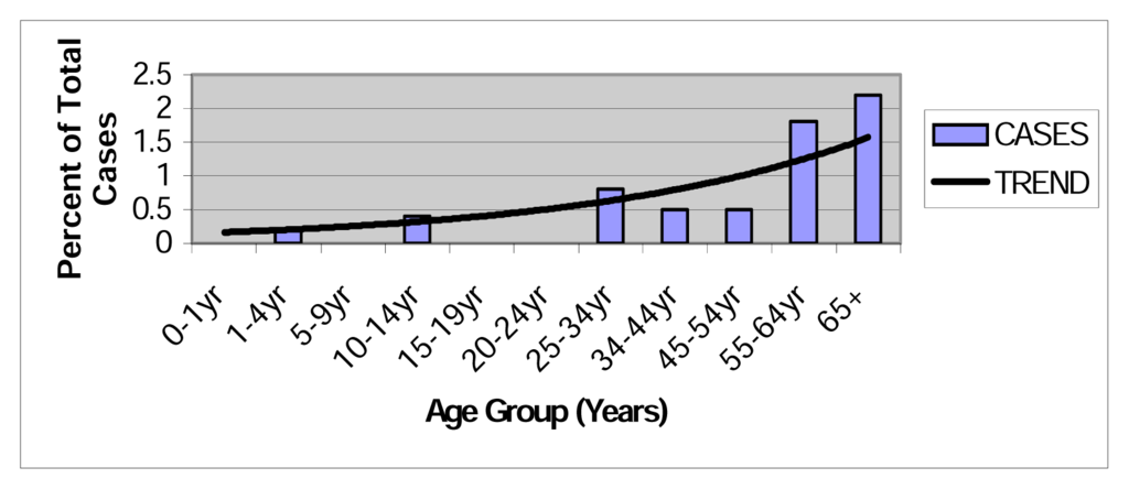 An analysis of salmonellosis for the state of Louisiana revealed that during the year 1999, there were a total of 718 reported cases of salmonellosis. This showed a 17% decrease in the number of cases that were reported in 1998. When looking at the years of reporting ranging from 1965–2001, the majority of the cases occurred during the late 1980s and among Caucasian infants, adolescents and the older population. The numbers of cases of salmonellosis in infants that were reported between the years of 1997–2001 were highest in the 0–1 year of age group and children in the 1–5 year of age group. According to the Louisiana Department of Health and Hospitals, the case fatality for salmonella is extremely low (0.2%). As shown in Figure 4, the case fatality increases with increasing age. Two parishes were noted as having the highest number of reported salmonellosis cases. St. Tammany Parish reported a total of 47 cases followed by Washington Parish with a total of 46 reported cases [13]. St. Tammany Parish, with a rate of 5.26 per 100,000, was found to be among the top three parishes reporting salmonellosis for the year 2000. Also among the top three during the year 2000 were Caldwell and Terrebonne Parishes with rates of 7.14 and 4.54 per 100,000, respectively. Terrebonne Parish was noted again in the year 2001 with a high rate of 4.13 per 100,000 [12].