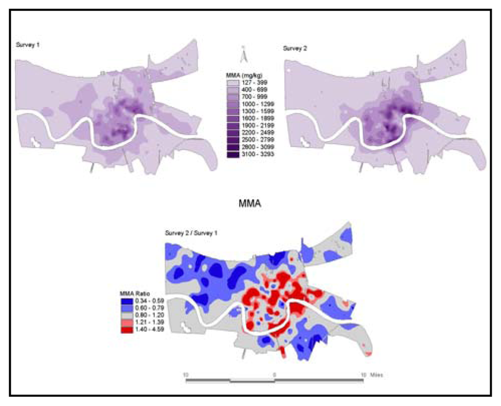 The following procedures were used to make MMA maps for each survey: First, the median soil MMA was assigned to the centroid of each census tract for both surveys. Second, the centroids with their corresponding MMA value were used to create a floating-point grid by kriging interpolation in Surfer 6.0. Third, the resulting Surfer grid was imported into ArcView GIS 3.3 using the Grid Machine extension. Finally, dividing the grid of Survey II MMA by grid of Survey I MMA created a ratio MMA grid reflecting the differences between the surveys [21, 22, 23].