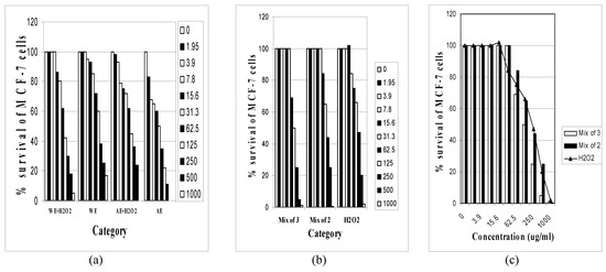 2 was performed. Cell survival indices were calculated from percent survival using regression analysis. Results showed that the alcohol extract and its mixtures were able to influence the survival of MCF-7 cells (indices ranged from 357.15- 809.50 Bg/ml in descending potency for H