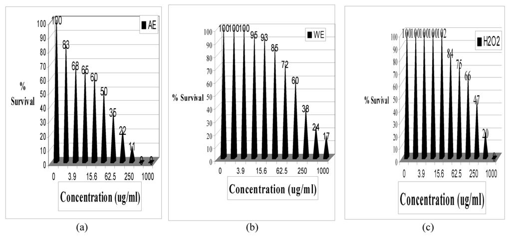 As can be seen both extracts and H2O2 showed death curves depicting varying dose-response relationships. The AE extract showed a very sharp dose-dependent decline of cell survival starting at the low concentration of 1.95 µg/ml, LC50 of 418.25 µg/ml. There was a lower population size in comparison to the other two, and an end point death between 250 and 500 µg/ml. Data for WE and H2O2 showed 7.8 and 125 µg/ml, 796.70 and 636.71 µg/ml for LC50’s. There was a medium and highest population sizes, and >1000 µg/ml death end point for both respectively (Table 1 and Table 2).