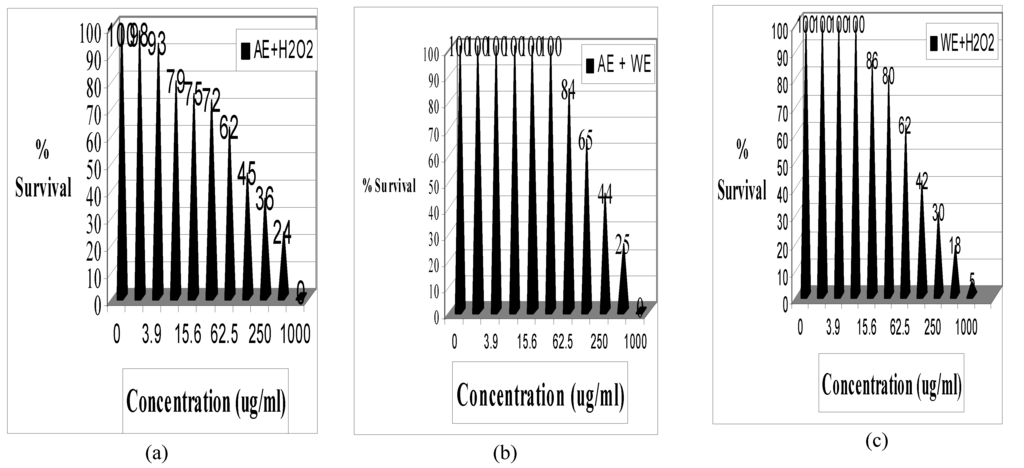 Figure 2 shows the results for the combinations of each extract with H2O2 and with each other. As can be seen in Figure 2a, the combination of AE and H2O2 showed death curves with the strongest dose-response relationship as based on the survival parameters. The AE+H2O2 combination showed a very sharp dose-dependent decline of cell survival starting at the low concentration of 1.95 µg/ml. There was a lower surviving population size in comparison to the other two and there was an end point death between 500 and 1000 µg/ml. Data for WE+H2O2 and AE+WE showed 7.8 and 62.5 µg/ml, medium and highest surviving population sizes, 500-1000 and >1000 µg/ml cell death endpoint respectively (Figure 2b,c).