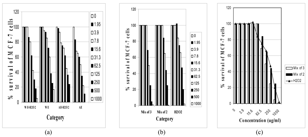 This study aims at assessing and analyzing the cellular responses of MCF-7 breast cancer cells to black seed alcohol and water extracts as well as their combination with each other and H2O2. Results on the cytotoxic effects of the alcohol (AE), water (WE) extracts of N. sativa L. and H2O2 individually on MCF-7 breast cancer cell line after 48 hours exposure by FDA assay and measured as % survival are respectively shown in Figure 1a, b, and c.