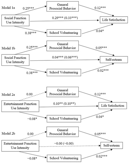 Unstandardized coefficients of the mediation model (controlling for other function use intensity, sex, age, smartphone use frequency, and school regions) depict prosocial behavior as a mediator between SNS function use and well-being. Note. N = 3452. Coefficients in parentheses illustrate the total effect without the mediators. EFUI was controlled for in Models 1a and 1b while SFUI was controlled for in Models 2a and 2b. Dashed lines represent a nonsignificant relationship (p > 0.05). * p < 0.05. ** p < 0.01. *** p < 0.001.