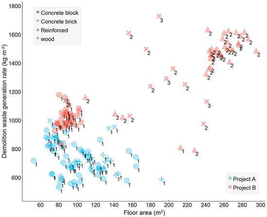 The DWGR data used in this study was the DW discharge (kg/m−2) records collected from demolition sites in redevelopment areas in two Korean cities (i.e., Daegu and Busan). For the collection of data on DWGR, information on the building features (i.e., location, structure, usage, wall type, roof type, gross floor area (GFA), and number of floors) was collected through a direct survey of 160 buildings prior to building demolition. Table 1 and Figure 2 show the building status and statistical analysis results based on the collected data. As can be seen in Table 1, the DWGR characteristics exhibited clear differences in mean values depending on the location, usage, structure, wall type, and roof type. Because the redevelopment areas mainly consisted of low-rise buildings, most of the DWGR data was distributed within the range of 1800 (kg·m−2) or lower. The scatter plot in Figure 2 shows the DWGR distribution characteristics according to the building area. Overall, the buildings in project B area showed large GFA and DWGR values, and the number of floors was found to be large. Many reinforced and concrete-brick structure buildings were distributed within the project B area.