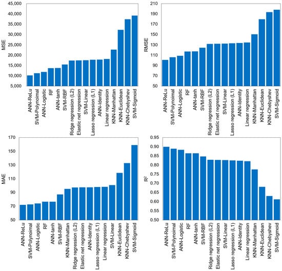 Although the models developed in this study showed different results depending on the algorithm applied, significantly different performance results were also observed depending on the selection of HPs despite the application of the same algorithm (Figure 3, Table 3). For the ANN model, the ANN-ReLu model (MSE of 10,160.03, MAE of 71.93, RMSE of 100.80, R2 of 0.900, and RPD of 3.16) exhibited a higher predictive performance than the ANN-Logistic, ANN-tanh, and ANN-Identity models, and its performance was found to be significantly different from that of the ANN-Identity model (MSE of 17,850.72, MAE of 97.59, RMSE of 133.61, R2 of 0.824, and RPD of 2.38). For the SVM model, SVM-polynomial (MSE of 11,265.73, MAE of 72.75, RMSE of 106.14, R2 of 0.889, and RPD of 3.00) also showed a higher predictive performance than the SVM-RBF, SVM-Linear, and SVM-Sigmoid models, and it exhibited a significant difference in performance from SVM-Sigmoid (MSE of 39,240.29, MAE of 159.07, RMSE of 198.09, R2 of 0.613, and RPD of 1.61). This confirms that the selection of HPs is quite important for ML model development depending on the algorithm type and that it has a significant influence on the predictive performance of the ML model.
