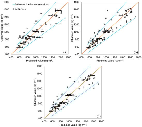 Comparison of the correlation between observed and predicted values: (a) ANN-ReLu, (b) SVM-polynomial, and (c) ANN-Logistic (The blue line in the graph means 20% error from the observed value).