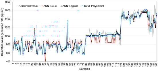 Comparison of observed and predicted values by ANN-ReLu, SVM-polynomial, and ANN-Logistic.