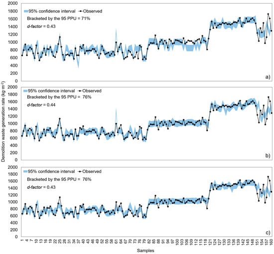 The goodness of fit of the model is evaluated by the d-factor, the average distance between the lower 95 PPU (2.5th, XU), and the upper 95 PPU (97.5th, XL), which can be evaluated as [51,54]: