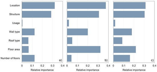 Figure 7 shows the relative importance of the input variables used in the ANN-ReLu, SVM-polynomial, and ANN-Logistic models developed for the DWGR prediction. For the ANN-Relu model, the location and structure showed a relatively higher influence than the other input variables. For the SVM-polynomial model, the location, floor area, structure, and wall type exhibited a high relative importance as input variables. In the case of the ANN-Logistic model, the floor area, number of floors, and wall type were relatively important, along with the location and structure. The location and structure were commonly used as input variables with a high relative importance for the ANN-ReLu, SVM-polynomial, and ANN-Logistic models. By contrast, the usage and roof type showed a low relative importance as input variables for all three models. In addition, it can be confirmed through Figure 7a,c that the importance of the input variables varies depending on the HPs applied despite the application of the same ANN algorithm.