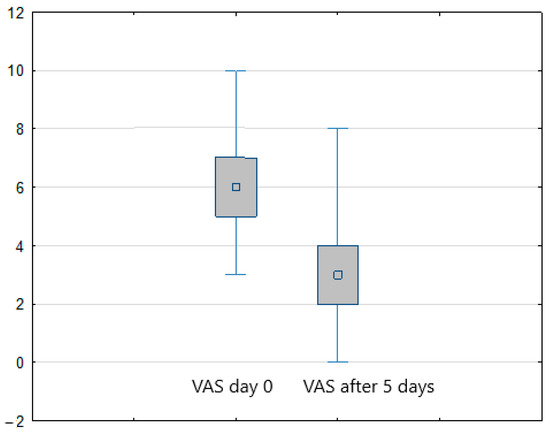 Reduction of pain (VAS score) in the FREMS (+ SOC) group after 5 days of treatment.