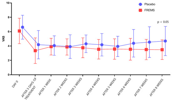 However, after 5 days of treatment, there was no statistically significant difference (p > 0.05) in VAS changes between the FREMS and the sham-FREMS group. The reduction in the intensity of symptoms was obtained after average 3.9 days of FREMS and after 3.2 days in the sham-FREMS group. There was also no statistically significant difference in the number of days after which a reduction in the level of pain perception was observed (p > 0.05). Nevertheless, the statistically significant effectiveness of FREMS therapy versus sham-FREMS was observed on the last day of follow-up (p < 0.05), i.e., after 8 weeks (Figure 3). Figure 4 shows how the treatment arms diverge to reach statistical significance in the 8 weeks.