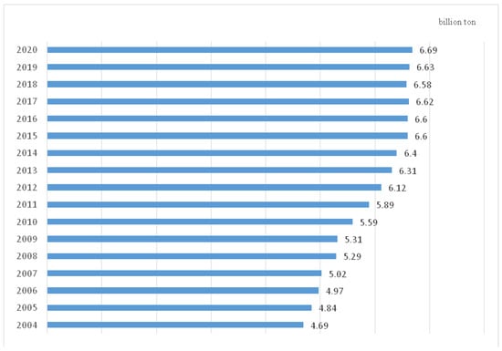 Historically, due to the sharp increase in population after 1949, China has faced the challenges of inadequate farm produce. The decision on what is grown and in what quantities remains highly centralized [2]. As an essential component of staple food, grain is given top priority in agricultural production. The government implemented a series of incentive policies to increase grain output. The introduction of the rural household contract responsibility system in 1978 was an epoch-making initiative. It encouraged de-collectivization, clarified the most basic production relations, created farmers’ enthusiasm for grain cultivation, and liberated rural productivity, leading to a vital increase in food production and improved inhabitants’ living standards. The entry of WTO in 2001 was a critical impetus to push China to be involved in the international market. Gradually, China became a key player in global farm production policy-making. Grain production has maintained an overall balance between supply and demand since 2004 and has continuously increased in subsequent years. As a result, the Chinese economy transformed from shortage to affluent. The abolition of agricultural taxes in 2006 was a milestone in China’s agricultural reform because it alleviated the economic burden on farmers and gave subsidies directly to grain growers. This innovative measure gave rise to the boom of grain plantations. The grain output has a stable annual increase and has maintained a high degree of sufficiency. In this way, China has successfully solved the problem of food shortage and malnutrition. Data released by National Statistics Bureau in December 2020 shows that China’s total grain output increased from 113 million tons in 1949 to 669 million tons in 2020. The per capita share of grain now exceeds 474 Kg, above the international food security threshold of 400 Kg. Figure 1 shows crop harvests have kept unprecedented growth for 17 successive years. China ranks as the largest agriculture-producing country in the world. Despite notable achievements in crop production, Chinese agriculture still faces many far-reaching challenges.