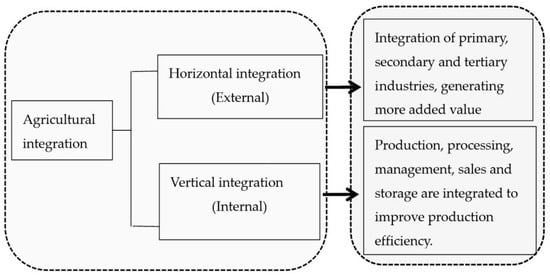 As illustrated in Figure 3, there are two kinds of agricultural integration. Horizontal integration refers to agricultural business expansion into secondary and tertiary industries to generate new sales models, such as contracted production and e-commerce sales, which can boost new consumption in rural areas and facilitate digital agriculture. Horizontal integration is an external integration that will enhance the radiation-driving effect, accelerating the construction of a unique pattern of modern agricultural development with the ecological origin, green products, and integrated industries with highly efficient output. It will be an excellent initiative to ensure sustainable agricultural development through competitiveness [29].