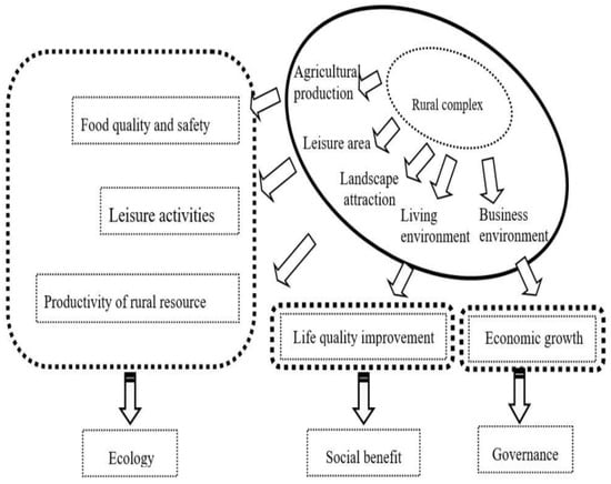In light of China’s economy transitioning from high-speed growth to high-quality development, the construction of ecological civilization has entered a critical phase. Ecological restoration in rural areas tends to be more significant as it is bound to food security, life quality, and rural sustainability. Sustainability integrates environmental, social, and economic foundational facets [33]. The ESG principle, a new set of ecological, social, and governance criteria, comprising three pillars of sustainability, will be given top priority in the optimization path of agricultural reform. In the context of rural complex, E means ecosystem or environmental-friendly developing mode, S stands for social development or urban–rural integration, and G stands for rural governance regarding the institutional arrangement and structural actions of agriculture and the farmer. Under the guidance of ESG, we provide a functional framework for the rural complex (see Figure 4).