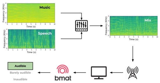 From the perspective of the audience, the received signal is a mixture emitted by TV broadcasters. That signal contains both musical and non-musical sources simultaneously, despite the music flows being separated from the other sounds at the moment of the production (Figure 1). Hence, it is difficult to measure the perceived loudness level of each signal source independently without applying source separation, or considering technical characteristics such as masking and frequency selectivity that strongly influence what the end user hears.