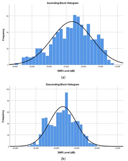 Histogram representation of the obtained SMR levels (in dB). (a) Ascending block. (b) Descending block.
