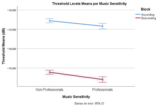 To determine if there exists an influence of subjects’ music sensitivity on background music detection, we performed a two-way ANOVA analysis on the obtained threshold level per block and music sensitivity level. For more consistency, we grouped participants into two categories: non-professionals (music enthusiasts and amateur musicians) and professionals (intermediate musicians and professional musicians). In Appendix A, Table A2 reflects there is a significant difference between music sensitivity level and experiment block (F(1, 1) = [1732.516], p = 0.000). Therefore, there is a clear influence of the music professionality of the participants on the detected thresholds. The more exposed to the music one is, the lower the background music detection threshold is found (Figure 3).
