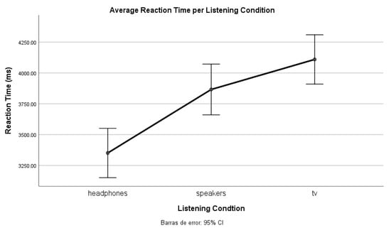 To prove there is an effect of listening conditions on the speed of the keyboard response (and hence on the audibility of the music), we performed a one-way ANOVA analysis (Table A3). As we expected, there is a significant difference between the listening conditions (F(2, 2413) = [14.399], p = 0.000). Nonetheless, Tukey’s HSD test for multiple comparisons (Table A4) found that the mean value of listening conditions was not significantly different between the TV and loudspeakers conditions (p = 0.219, 95% C.I. = [−99.656, 586.619]). Another relevant finding is that the smallest reaction time is obtained with headphones whereas the highest corresponds to TV (Figure 4). According to the distance between the TV and the subjects, the time required for the sound wave to travel from the source to the human ear (max. 6 ms) is not large enough to justify the overall discrepancy.