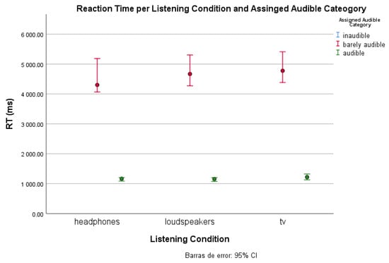 To estimate the classification of clips into a determined audibility category, we set the threshold between the audible and barely audible classes at 2 s of reaction time. Regarding the inaudible class, we established, (and instructed the participants accordingly) that no interaction with the keyboard meant no music perception. In Figure 5, we can observe that with headphones participants have a faster median RT. Instead, both loudspeakers and TV conditions show a higher RT. We can acknowledge this difference for the barely audible classification: close to 4 s in headphones and close to 5 s for the other two.
