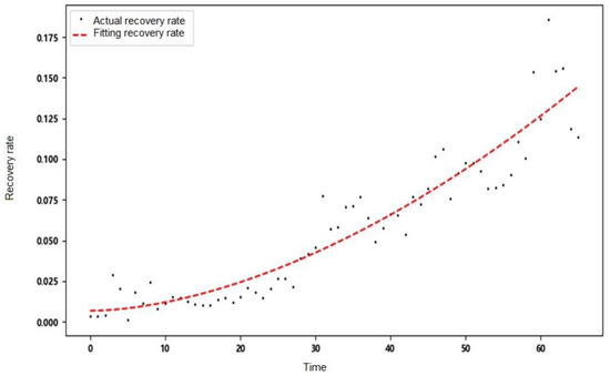 In this paper, the cure rate was regarded as a time-varying parameter, and the COVID-19 epidemic data of Xinjiang, China, from 16 July to 27 August 2020 were used to fit and substitute the SEAIHR model. The fitting results of the cure rate are shown in Figure 9.