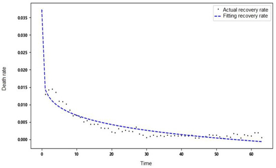 The recovery rate and death rate in Wuhan show a trend of change over time. The two parameters are set as time-varying parameters to simulate the real situation of the epidemic development more accurately. The fitting results are shown in Figure 3 and Figure 4.