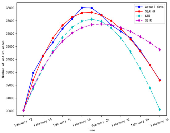 Figure 10 shows that the SEAIHR model is more accurate in fitting the actual data, and the fitting error is only 3.1%. Compared with the SIR and SEIR models, it accurately simulated the COVID-19 epidemic development and the change in the number of existing cases.