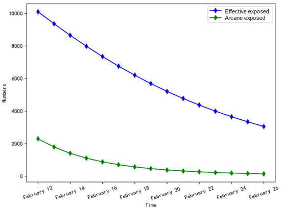 As shown in Figure 7, the number of effective exposed persons decreased by 70%, and the number of arcane exposed persons decreased to 143, indicating that the epidemic spread was effectively controlled with the increase of tracking and isolation intensity and the enhancement of self-protection awareness.
