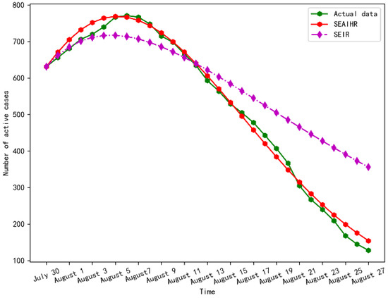It can be seen from Figure 11 that the SEAIHR model is more accurate than the SIER model in predicting the time of the inflection point and the trend of epidemic decline. The inflection point of the epidemic occurred around 6 August, and the number of confirmed cases reached a peak at this time (a peak of about 771). It shows that the government’s various prevention and control measures have controlled the outbreak of the local epidemic in a relatively short period of time. Compared with the epidemic in Wuhan, Xinjiang only took about 20 days to control the epidemic, and the number of persons admitted to hospitals for confirmation did not exceed 800. It also can be seen that the number of confirmed cases was reduced to 150 at the end of August, indicating that the epidemic situation was basically stable.
