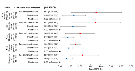 The interaction analysis indicated a significant interaction between race and cumulative work stressors with psychological distress as the outcome (p < 0.05). Stratified analyses demonstrated differential responses to work stressors by racial and ethnic group, with results presented in Table 3 and Figure 2. Compared to Whites, Hispanic, and Asians, participants who were a racial or ethnic minority or two or more races who experienced two or more stressors had the highest psychological distress (β and 95% CI = 3.57 [1.10, 6.05]), followed by Black participants (β and 95% CI = 3.51 [1.09, 5.93]). White, Hispanic, and Asian participants who experienced two or more stressors showed increased psychological distress (βs and 95% CIs = 1.54 [0.99, 2.08], 2.20 [1.03, 3.78], and 2.00 [0.55, 3.45], respectively).