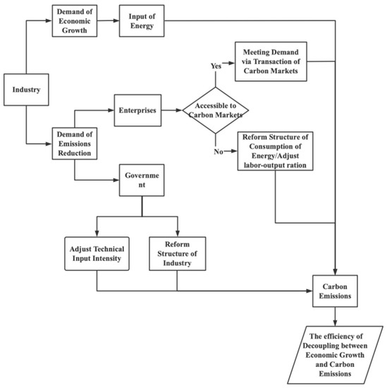 Chinese industrial enterprises face two major demands: high economic growth and carbon emission reduction. However, the demand for economic development inevitably leads to an increase in energy consumption, increasing CO2 emissions, which runs counter to the demand for carbon emission reduction in industrial enterprises. Under the premise of economic development, promoting carbon emission reduction in industrial enterprises has become an important breakthrough point to resolving the above contradictions. Industrial enterprises and the government will implement measures to balance the “economy and being green.” The transmission mechanism for decoupling the industrial economy from carbon is shown in Figure 1.