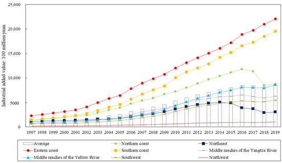 Generally, China can be divided into eight economic zones. The industrial structure and development level of each economic zone are different, resulting in obvious regional differences in industrial added value and industrial carbon emissions. (See Figure 2 and Figure 3 for details.) The most influential and multifunctional manufacturing center on the Eastern coast and the manufacturing center of high-tech products on the southern coast always have the highest average industrial added value, and the average industrial carbon emissions on the eastern coast are also high. Northwest is an important energy strategic replacement base, and the tertiary industry in the southwest is developing rapidly. These two economic zones are both vast and sparsely populated, and their economic development conditions are poor, so the average industrial added value is the lowest, and the average industrial carbon emissions are always low. The middle reaches of the Yellow River are the largest coal mining and deep processing base, natural gas and hydropower development base, iron and steel industry base, and non-ferrous metal industry base. The northern coastal area is one of the most powerful high-tech R&D and manufacturing centers. The average industrial carbon emissions of these two economic zones are always high. The northeast is the manufacturing base of energy and raw materials, with large energy consumption but a low level of economic development, so the average industrial added value is smaller, but the average industrial carbon emissions are higher. The middle reaches of the Yangtze River are a raw material base dominated by iron and steel and non-ferrous metallurgy, and the average industrial carbon emissions and average industrial added value belong to the medium level in the eight major economic zones.