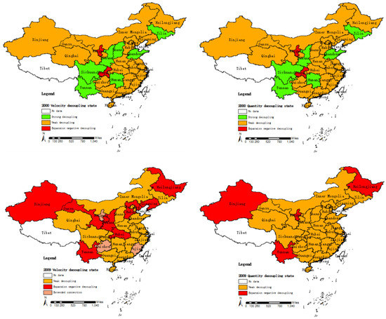 (2) The velocity decoupling index and quantity decoupling index for each province in China have some differences from the decoupling state to the decoupling development process, and, in general, the quantity decoupling index is better than the velocity decoupling index.