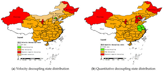Furthermore, the decoupling model quantifies the relationship between industrial carbon emissions and industrial economic growth in the various provinces of China. Figure 4a shows the change in velocity decoupling distribution in various provinces in China. Due to space limitations, this paper only presents the relevant data from three long-interval years, 2000, 2009, and 2019. As can be seen from the figure, the overall velocity decoupling of Chinese provinces has proceeded from a strong decoupling to a weak decoupling to a gradual recovery of a strong decoupling. In 2019, 83.33% of China’s provinces achieved industrial carbon emission decoupling (including strong decoupling and weak decoupling), most of which were weak decoupling, while 16.67% of the provinces had not yet achieved industrial carbon emission decoupling. This shows that the industrial development of most provinces in China has entered the stage of carbon emission decoupling. Only a few provinces have achieved the best state of decoupling, while some provinces have not achieved industrial carbon decoupling and are still in the state of expansion connection or expansion-negative decoupling. Figure 4a shows the change in quantity decoupling distribution in various provinces in China. For comparison purposes, only the distribution of relevant results in 2000, 2009, and 2019 is shown here. It can be seen that the quantity decoupling state is relatively concentrated, which is mainly divided into three types: strong decoupling, weak decoupling, and expansion negative decoupling. In 2019, 86.67% of China’s provinces achieved industrial carbon emission decoupling (including strong decoupling and weak decoupling), most of which were also weak decoupling, and 13.33% of the provinces were in the state of expansion negative decoupling.
