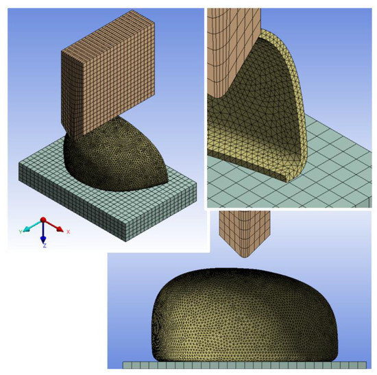 The numerical model was performed with three independent parts: the representative striker body, a bottom layer for the constrained support of the toecap, and the toecap model which performed the numerical analysis. The analysis model was developed on 3D solid elements. The toe cap model was discretized into tetrahedral structural solid elements with sizing mesh control. The other two solid parts were discretized into quadrangle-based prism elements (Figure 2).