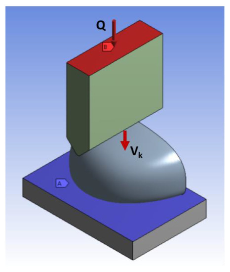The FEM boundary conditions included: the striker velocity vector immediately before impact Vk = 4480 mm/s; loading Q = 18.8 kg applied to the upper surface of the striker (to give an overall loading of 20 kg including the weight of the striker of 1.2 kg); and attachment with three blocked degrees of freedom (x, y, z) on the upper surface of the baseplate as shown in Figure 3.