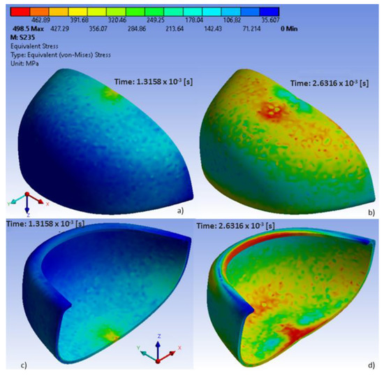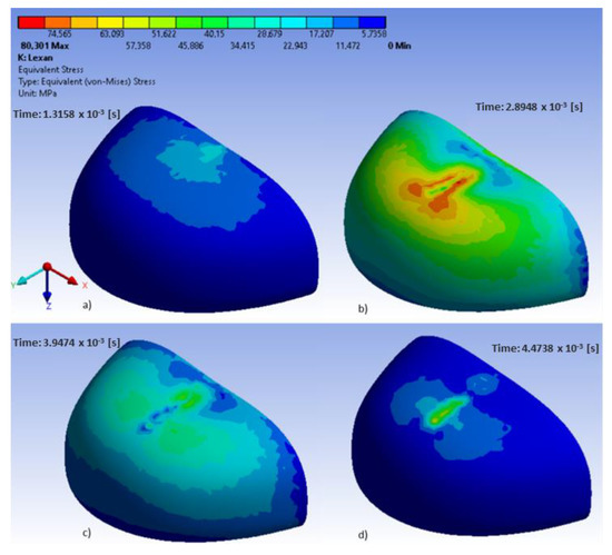 Equivalent stress in polycarbonate toecaps at different time steps: (a–d) external side.