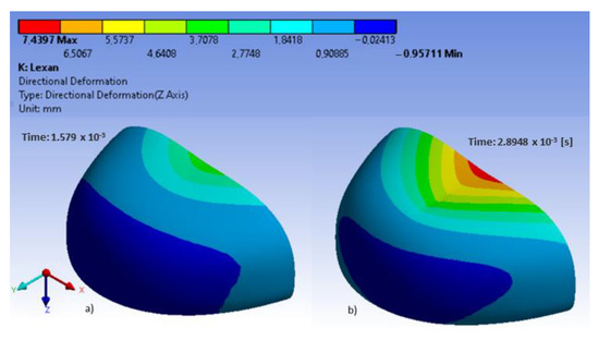 Rodrigues et al. [37] evaluated a solid mechanics toolbox, built in the open-source computational library, OpenFOAM, to simulate compression and impact tests, which was used to assess commercially available plastic toecaps. The stresses developed during the impact tests are distinct from those in the compression tests, exhibiting a wave-like propagation form from the top to the bottom. In the present study, in polycarbonate toecaps, there was a local stress concentration around the area of impact. The greatest equivalent stress was found in the middle of the upper wall near the area of impact, with the resulting deformation being 7.4 mm (Figure 5).