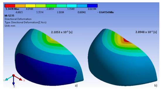 In the analyzed models, the location of maximum stress and deformation largely depended on their shape. In polycarbonate toecaps type B, the greatest equivalent stress (80.3 MPa) was found in the middle of the upper wall near the area of impact (Figure 4), with the resulting deformation being 7.4 mm (Figure 5). In turn, in steel toecaps type A the highest equivalent stress (approx. 500 MPa) occurred on the topmost edge of the upper wall and in the bottom segment near the baseplate (Figure 6). In toecaps made from S235 steel, upper wall deformation amounted to 5.34 mm (Figure 7).