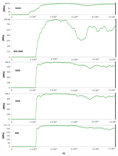 Analysis of results also shows the importance of toecap material in safety footwear. Figure 8 and Figure 9 show the node with the highest stress and deformation-value-over-time charts. Whereas all steel toecaps were characterized by the same geometry (type A), the strength curve for AISI 1045 steel differed unfavorably from the others, exhibiting a highly irregular course. Indeed, toecap behavior under dynamic loads depends on the type of steel used. Ultimately, the stress–strain state of toecaps is affected by the material hardening phenomena caused by striker impact. In polycarbonate toecaps, there was a local stress concentration around the area of impact, whereas in steel toecaps the stress was distributed over a considerably larger area.