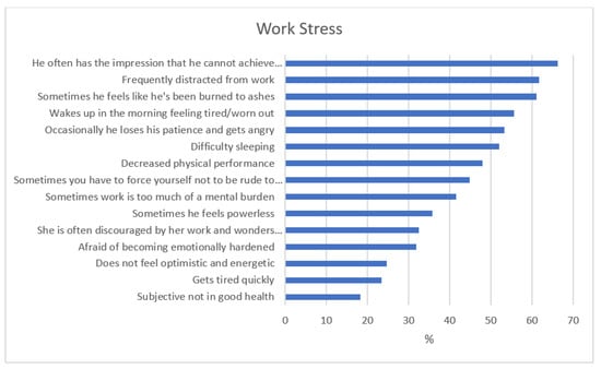 On the basis of the answers given to the questions related to workload and work stress, it was found that the most important problems were related to job organization, the emotional pressure of the work and the relationships among the personnel. Figure 1 and Figure 2 show where the most and least problems occurred.