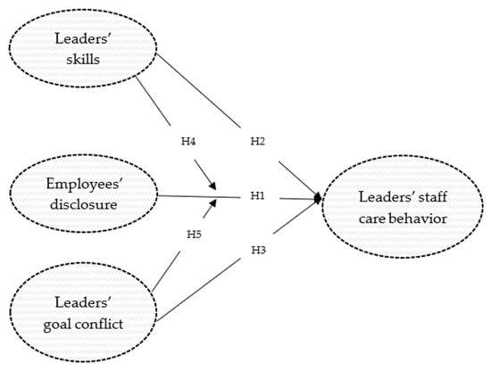 The AMO framework postulates that high employee performance is a result of employees’ abilities (knowledge, skills), motivation, and opportunities to use their abilities and motivation [,,]. The model itself was developed to predict employee work performance [] and was later applied to the field of human resource management (HRM). The practical recommendation for HRM aiming at maximizing employee performance was to enhance employee skills, motivation, and opportunity to contribute (e.g., extensive training, rewards, information sharing; []). In this study, we apply and adapt the AMO framework to leadership behavior as an important part of their performance. Following the three predictors in the AMO framework [,,], we focus on three antecedents of staff care behavior that may be especially relevant in the situation where a leader perceives that an employee displays warning signals (staff care awareness) and wants to take further health-oriented actions (staff care behavior) in a next step. These three antecedents are (1) leaders’ health-oriented leadership skills, (2) leaders’ (reduced) motivation due to the experience of a goal conflict (employee health vs. the importance of the employee for the leader’s goal achievement), (3) employees’ disclosure that serves as the opportunity and permission for leaders to use their skills and motivation.
