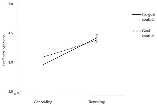 Interaction Effect Between Disclosure (Concealing vs. Revealing) and Goal Conflict (No Goal Conflict vs. Goal Conflict) on Staff Care Behavior.