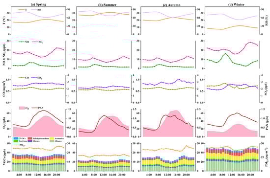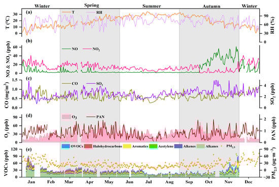 - Liu, T.; Chen, G.; Chen, J.; Xu, L.; Li, M.; Hong, Y.; Chen, Y.; Ji, X.; Yang, C.; Chen, Y.; et al. Seasonal characteristics of atmospheric peroxyacetyl nitrate (PAN) in a coastal city of Southeast China: Explanatory factors and photochemical effects. Atmos. Chem. Phys. 2022, 22, 4339–4353. [Google Scholar] [CrossRef]