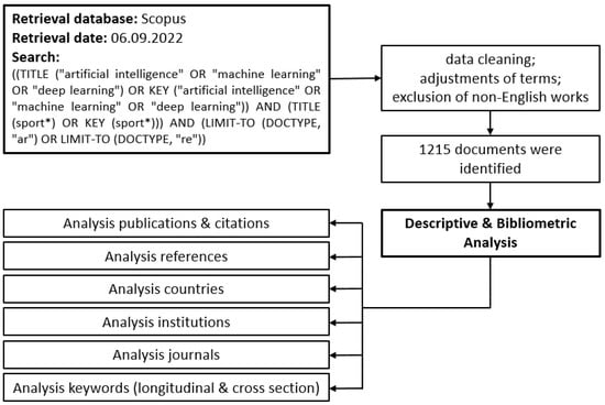 Although several bibliometric studies use the World of Science database [,], data from the Scopus database were used for this study (accessed on 6 September 2022). This decision is based on the platform’s broad geographic and thematic coverage that it offers. In particular, with regard to the intended research aim, Scopus seems advantageous as it has a larger journal coverage compared to Web of Science, especially in the fields of social sciences and arts and humanities []. Additionally, this database has been extensively used in sports related bibliometric analyses [,,,]. To map the most prominent subcategories of artificial intelligence, the terms “machine learning” and “deep learning” were included in the search, and “artificial intelligence” was the general term. It should be noted that the Scopus search engine is not case-sensitive and considers hyphens as spaces.